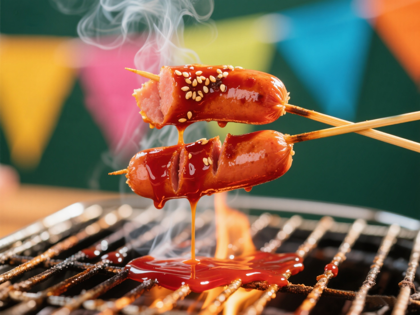 ② 煎烤:平底鍋刷薄油 → 中火煎串 1分鐘 → 刷照燒汁